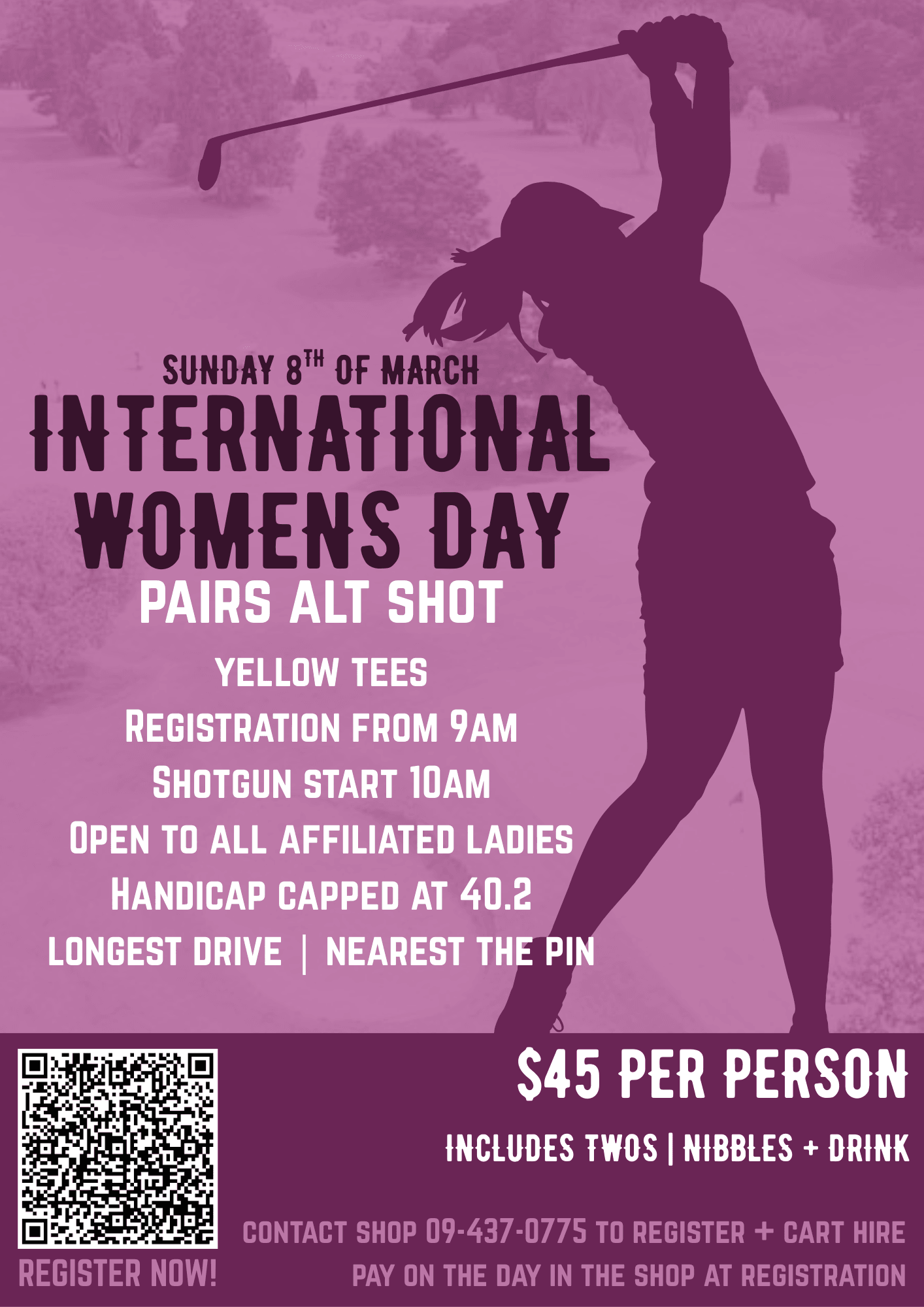 Celebrate International Women’s Day on the green — exclusively for ladies! Grab a partner and join our fun 9-hole pairs tournament, with a drink and tasty nibbles included. Whether you’re a seasoned golfer or just starting out, enjoy a day of friendly competition, laughter, and connection while celebrating women in golf.